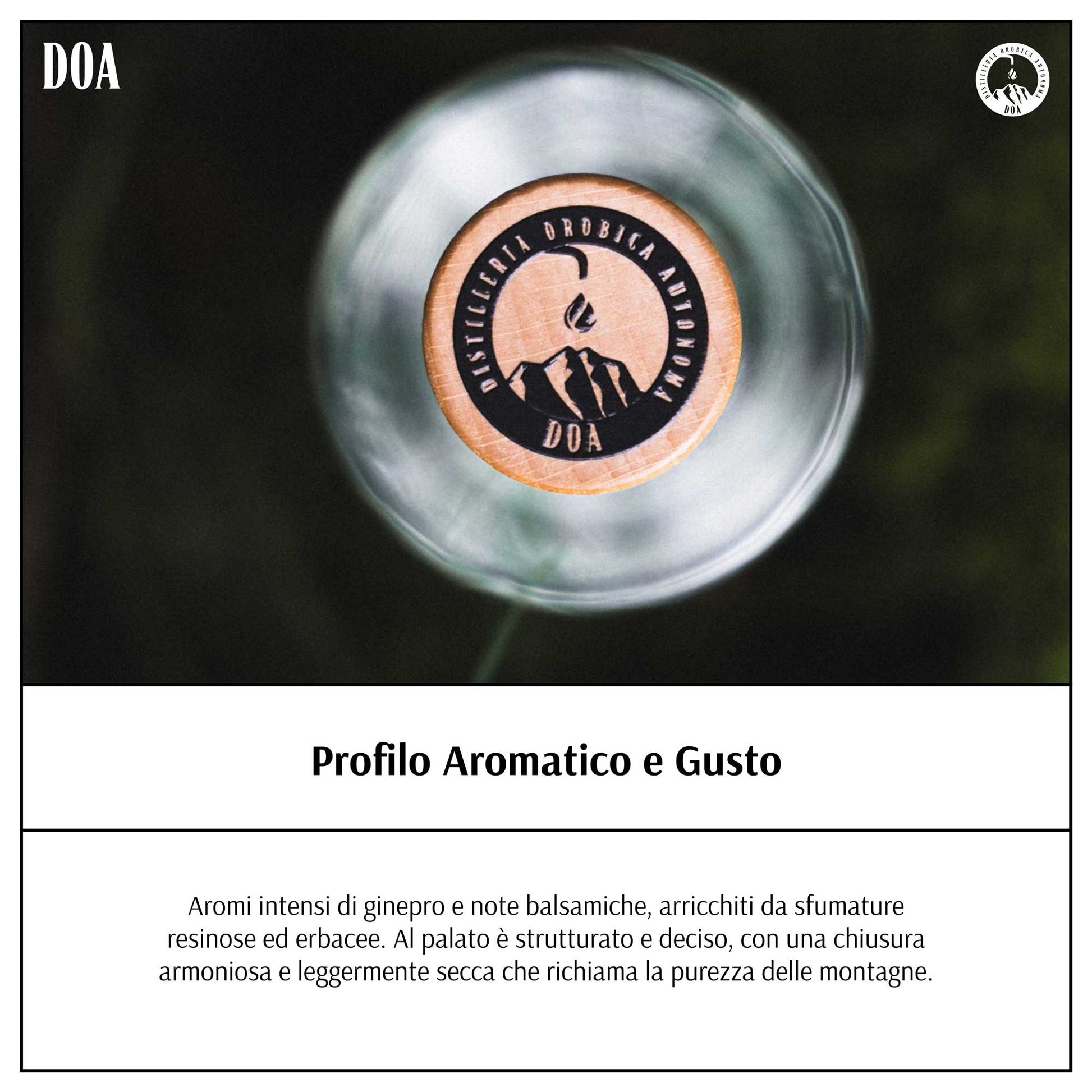 Aromi intensi di ginepro e note balsamiche, arricchiti da sfumature resinose ed erbacee. Al palato è strutturato e deciso, con una chiusura armoniosa e leggermente secca che richiama la purezza delle montagne.