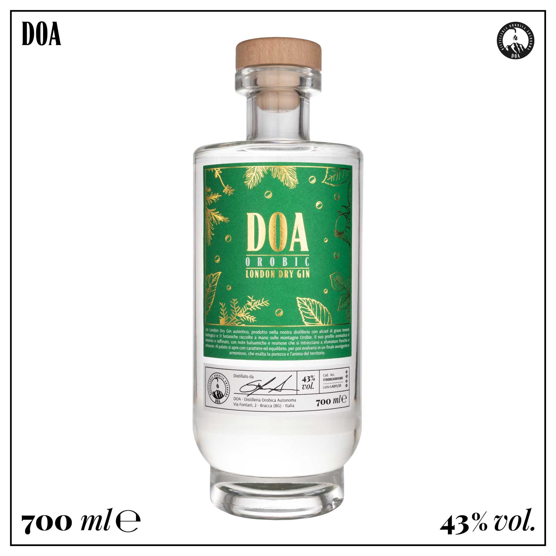 Distillato artigianalmente in Italia con alcool di frumento biologico. Le botaniche provengono esclusivamente dalle Orobie e vengono selezionate manualmente per garantire un profilo aromatico puro e distintivo.